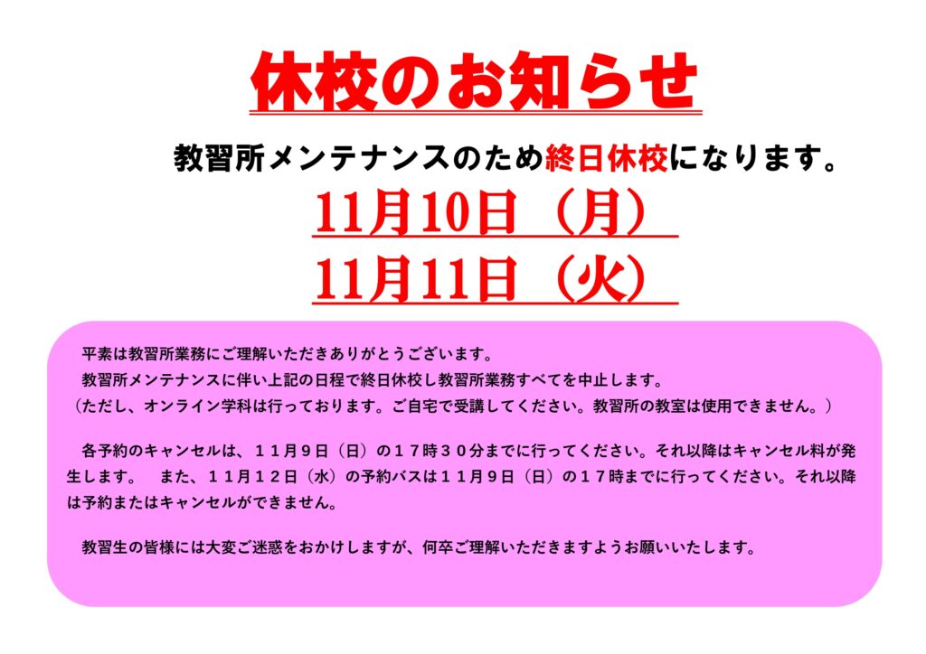 メンテナンス日休校のお知らせ